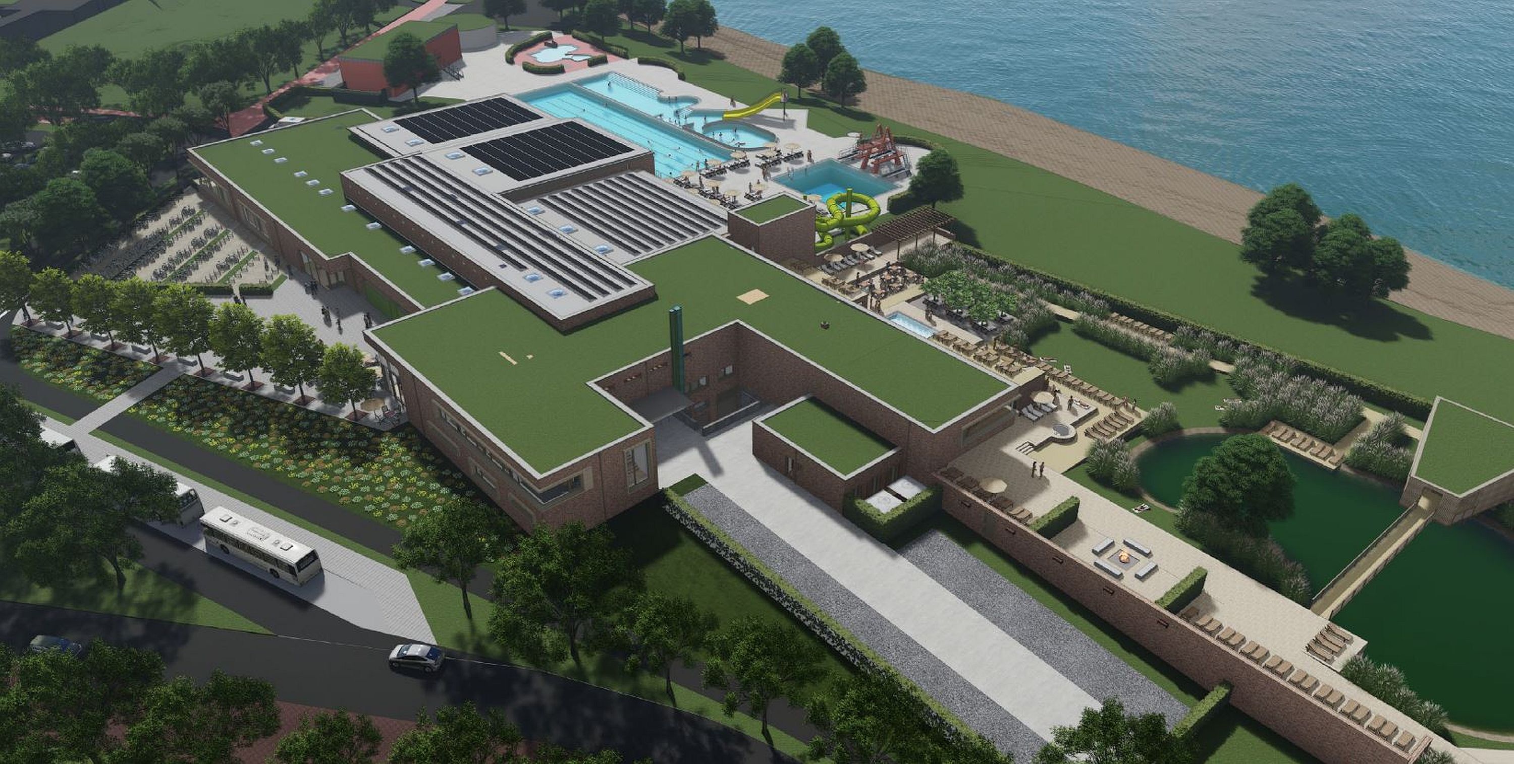 Das Gebäude wird in Massivbauweise errichtet. In den Schwimmbereichen sind Holzbinder mit einer