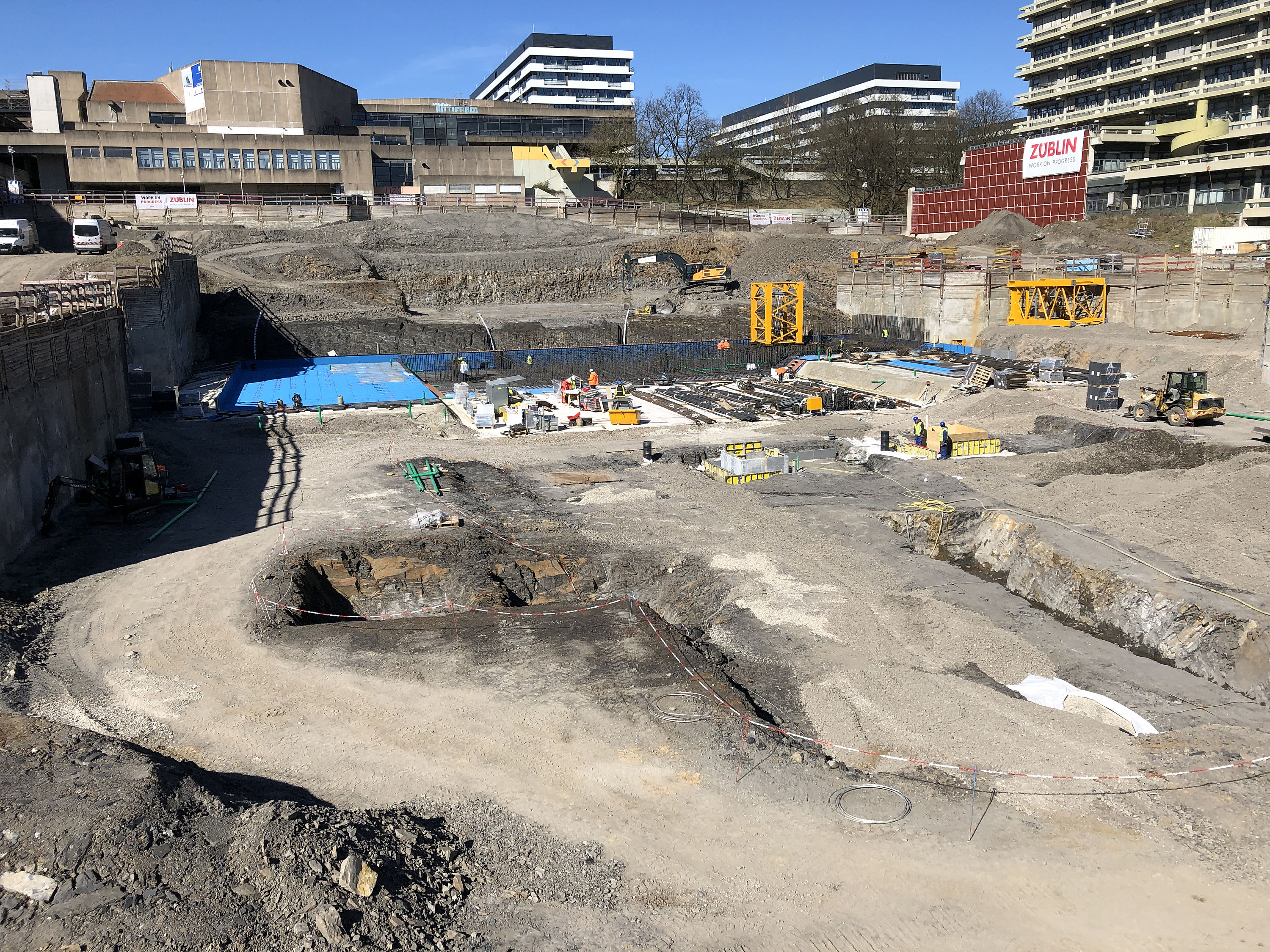 Das Tragsystem des insgesamt 14-geschossigen Stahlbetonbaus setzt sich zusammen aus Flachdecken, Stützen, Wänden, Kernen sowie Bodenplatten in unterschiedlichen Höhenlagen.