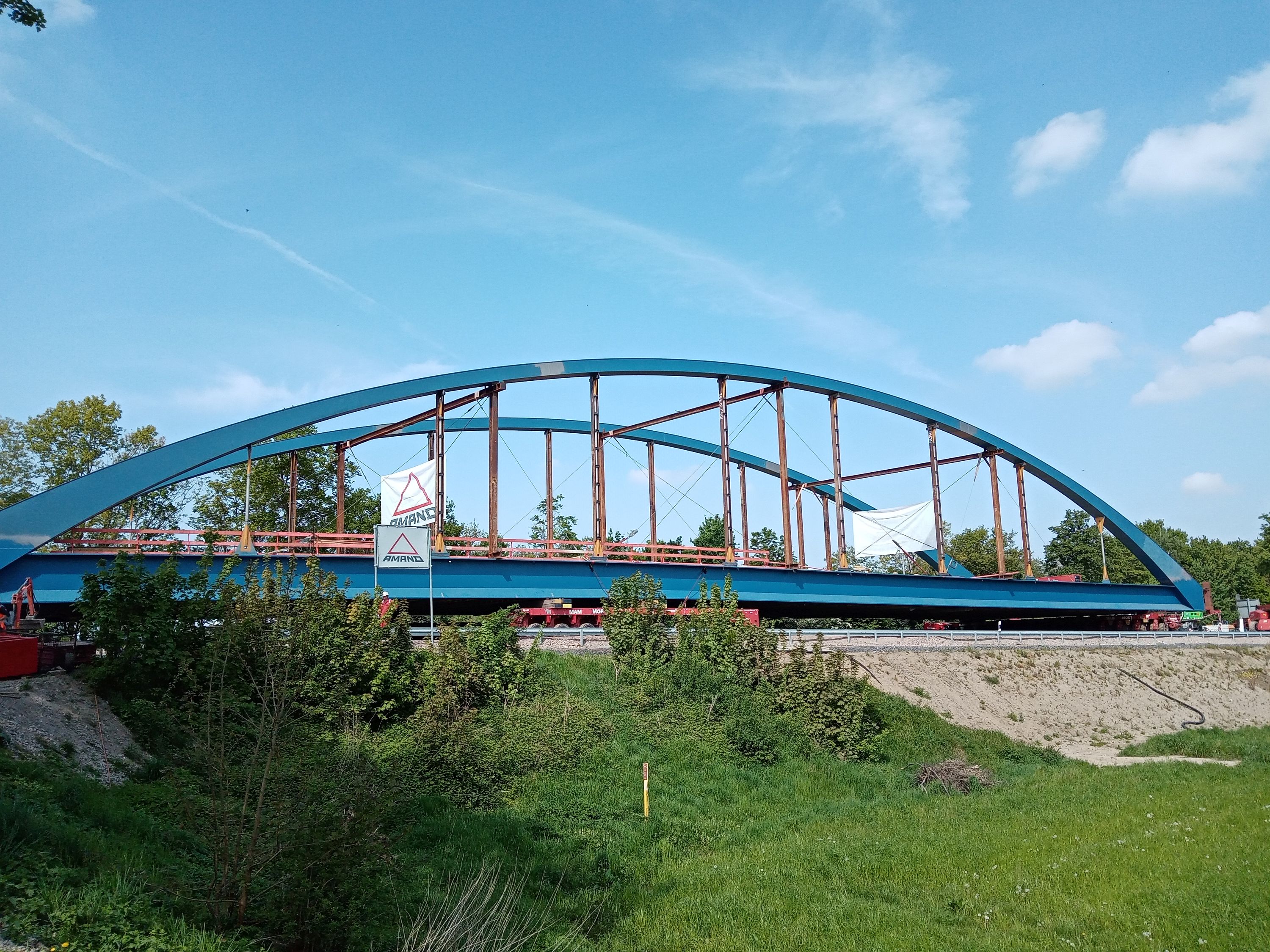 Die Bilder zeigen den Rückbau der Behelfsbrücke, sowie das Einschieben des neuen Überbaus.