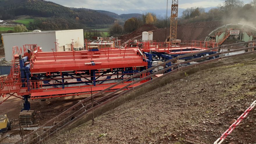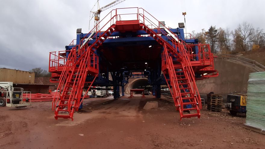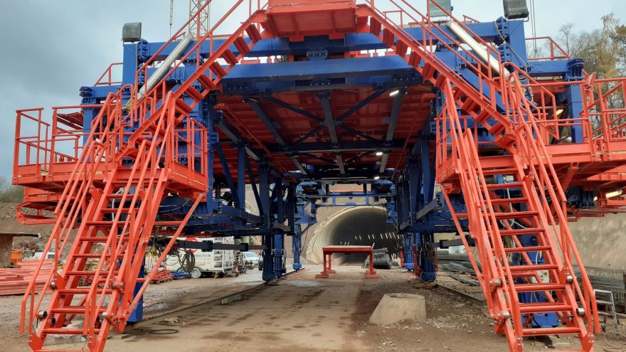 Tunnelbauwerk im Zuge der Verlängerung der A 44Stählerner Bewehrungs-, Magazin- und Nachbehandlungswagen